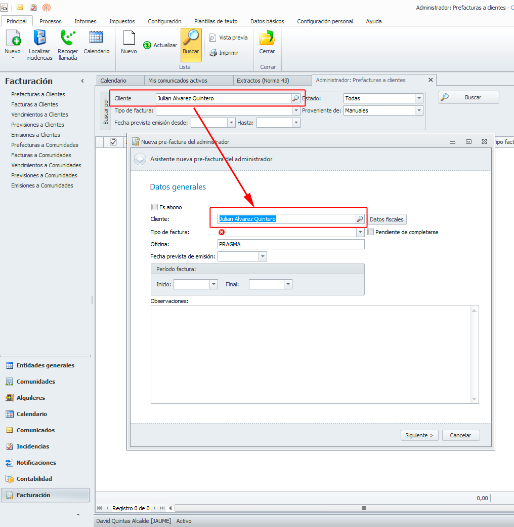 Si la lista de pre-facturas la tenemos filtrada por un cliente en específico, al dar de alta una nueva pre-factura, el asistente prefijará el cliente que teníamos en la lista.