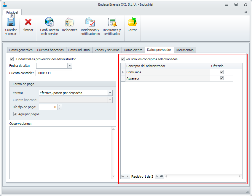 Se añade la lista de conceptos del administrador en la ficha del proveedor. Estos conceptos representan los conceptos por los cuales el proveedor le va a facturar al propio administrador. De este modo, cuando demos de alta una factura de proveedor, estos conceptos saldrán predeterminados.