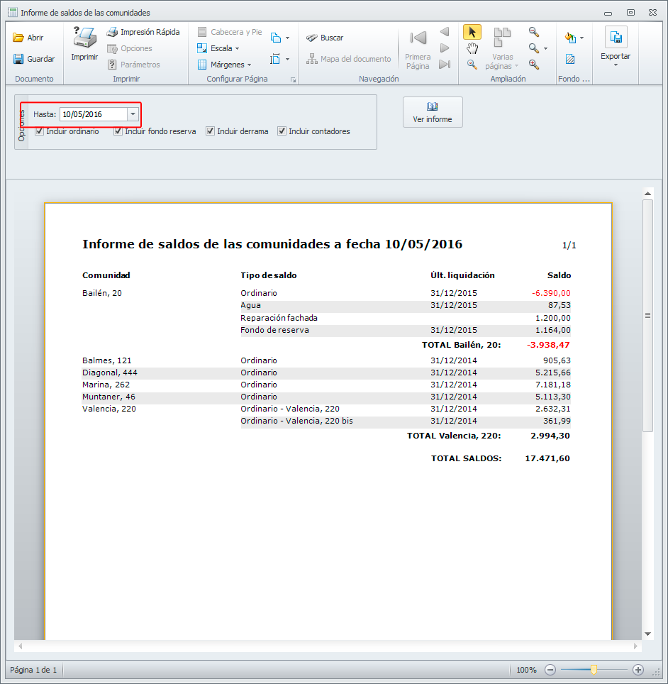 Nuevo informe de saldos de comunidades. Muestra una lista con los saldos de liquidación de todas las comunidades a la fecha introducida, permite mostrar los saldos de fondo ordinario, derramas y fondo de reserva. Indicando en rojo los saldos negativos. (Informes->Saldos de comunidades).