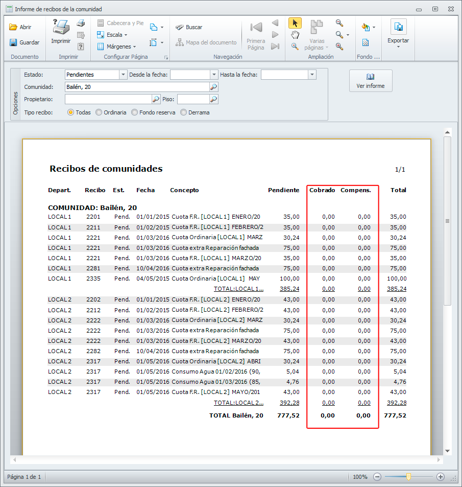 En el informe de recibos de la comunidad, se han añadido dos campos nuevos ‘Compensado’ y ‘Cobrado’. De esta forma podremos ver aquellos recibos que tengan un importe compensado o cobrado.