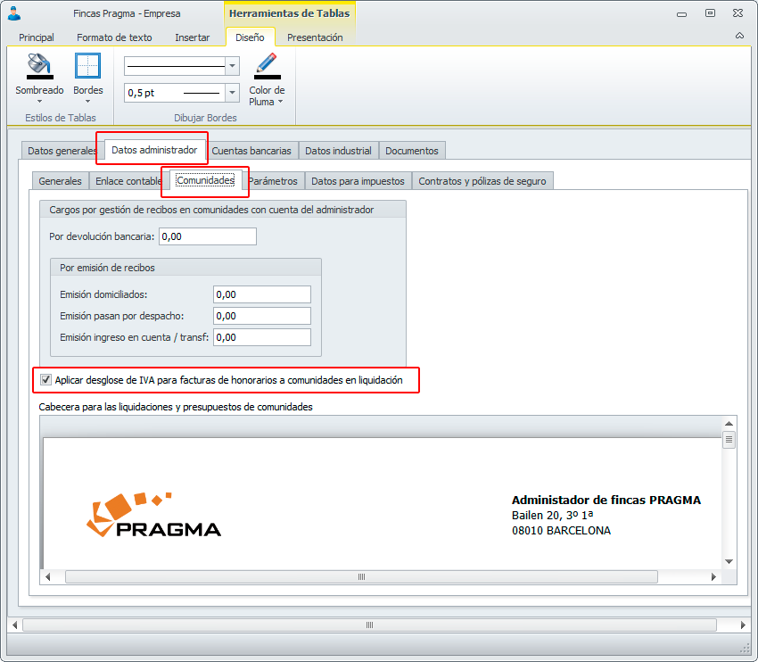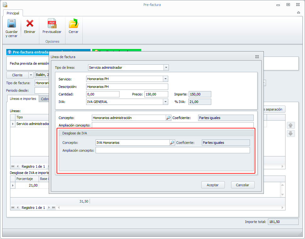 Contabilización de forma separada de los honorarios de administración e IVA. Para que el sistema desglose estos conceptos, en la ficha de “Datos Empresa” pestaña Datos Administrador->Comunidades debemos marcar la opción “Aplicar desglose de IVA para facturas de honorarios a comunidades en liquidación”. De esta manera, cuando demos de alta la previsión o la pre-factura, debemos introducir el concepto del plan de gasto por el cual se imputará el IVA .