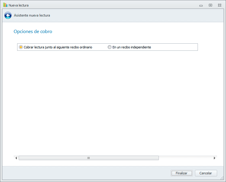 Se permite generar las cuotas de contadores en fechas diferentes a la de las cuotas ordinarias. Ahora, al dar de alta la lectura, el sistema nos pregunta si queremos cobrar dicho importe en el siguiente recibo ordinario o en un recibo independiente.