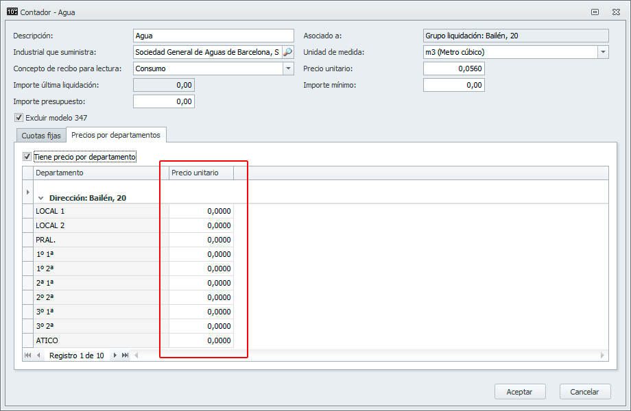 En contadores, el precio unitario por departamento permite introducir un importe con 4 decimales.