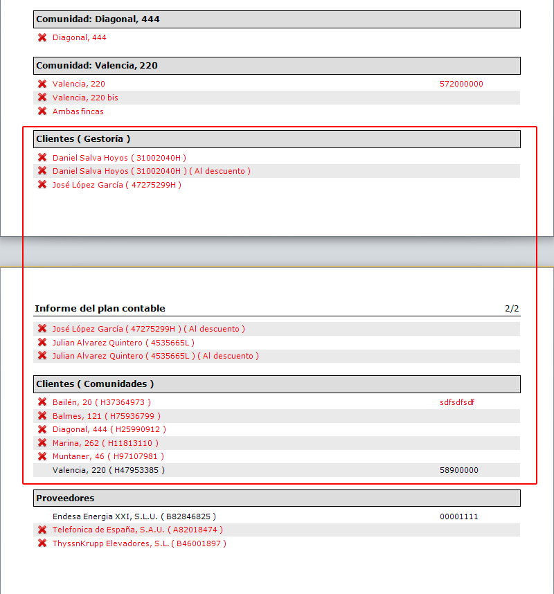 En el Informe de plan contable se muestran los clientes separados en dos grupos, clientes de tipo gestoría y clientes de tipo comunidades.