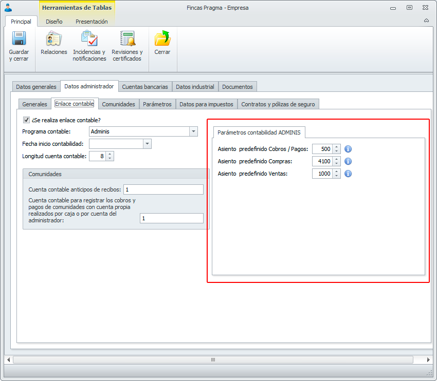 En la ficha ‘Datos empresa’ donde se configura toda la información referente al Administrador, en el apartado ‘Enlace contable’, se ha añadido el apartado ‘Parámetro contabilidad ADMINIS’ que permite fijar los asientos predefinidos para Cobros/pagos, Compras y Ventas.