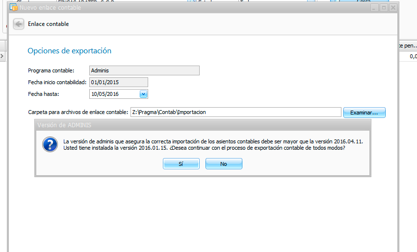 En la exportación contable hacia adminis, se requiere que Adminis esté a una versión superior a 2016.04.11. En caso de no estarlo, el sistema pregunta si usted desea continuar con la exportación bajo su responsabilidad. Tenga en cuenta, que de seguir adelante, adminis no realizará los asientos en el cuaderno del IRPF.