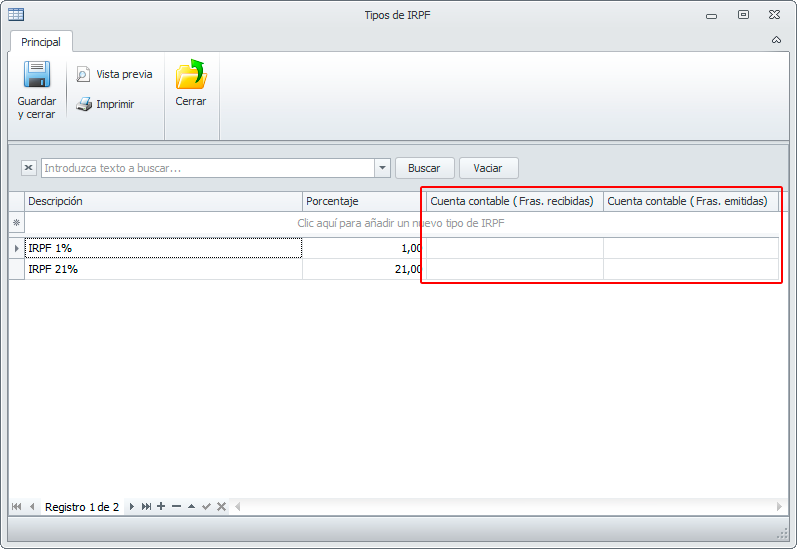 Se permite introducir cuentas contables para cada tipo de IRPF. (Datos básicos->Tipos de IRPF).