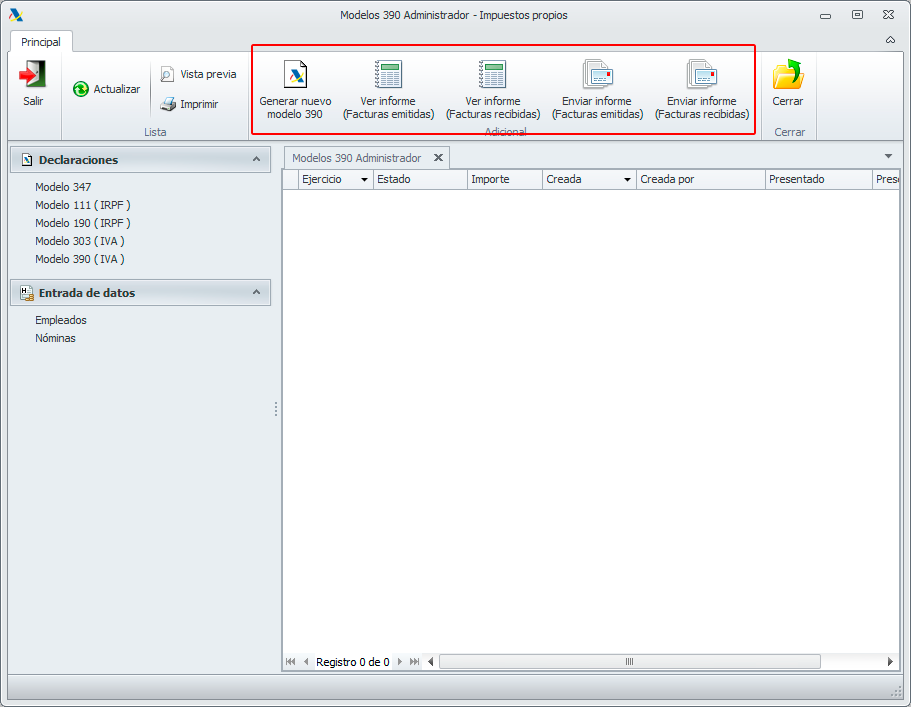 Al entrar en la opción del “Modelo 390”, además de mostrar la lista de los modelos 390 generados, aparecen las siguientes opciones: