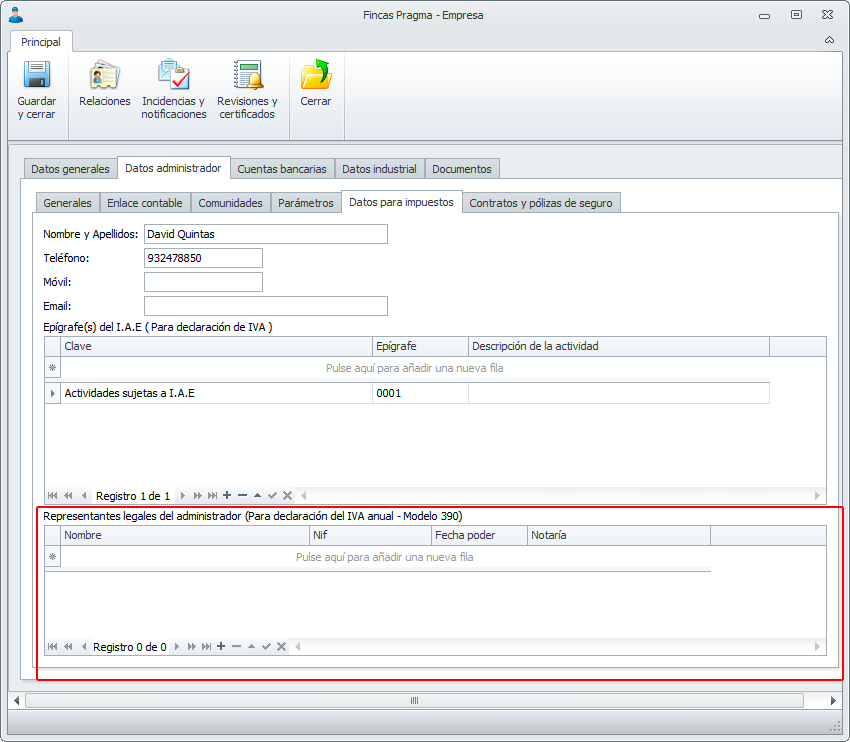 Para la presentación del modelo 390 podemos especificar el representante legal (necesario para cuando el administrador es una empresa, es decir persona jurídica). Esta información se introduce en Configuración->Datos empresa pestaña Datos administrador->Datos para impuestos apartado "Representantes legales para el administrador".