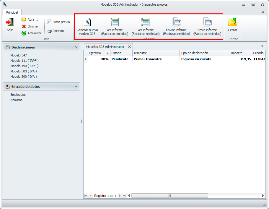 Al entrar en la opción del “Modelo 303”, además de mostrar la lista de los modelos 303 generados, aparecen las siguientes opciones: