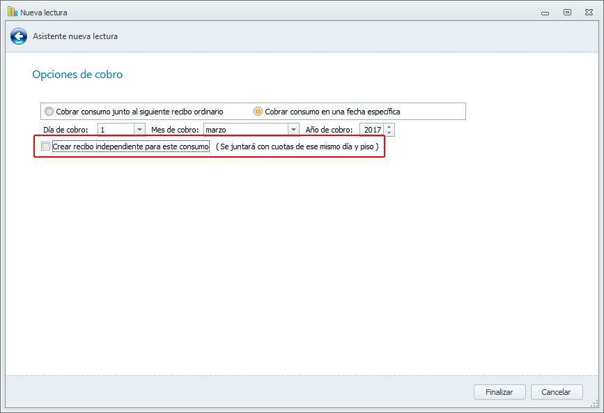 Al dar de alta una nueva lectura de contador, se añade un check que permite cobrar las cuotas de consumo en recibos independientes siempre y cuando marquemos la opción de 'Cobrar consumo en una fecha específica'.