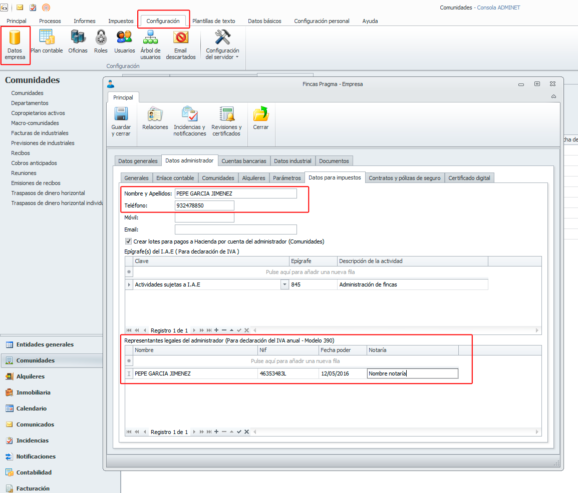 Antes de realizar la presentación del modelo 184 debe cumplimentar la información que se encuentra en la ficha 'Datos empresa' apartado 'Datos administrador' pestaña 'Datos para impuestos'. Aquí debe introducir los datos de la persona de contacto y del representante.