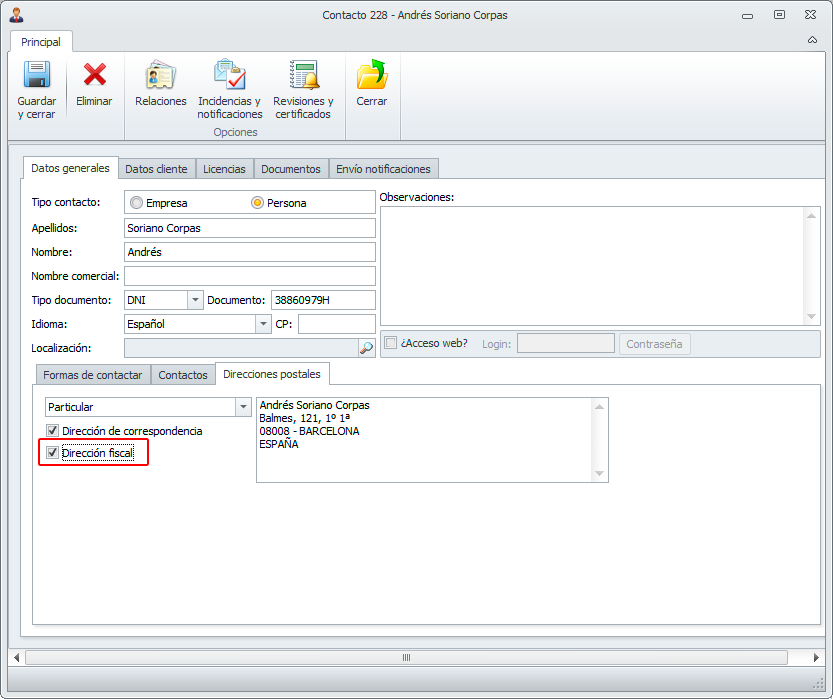 De las comunidades que requiera la presentación del Modelo 184, debe revisar los copropietarios activos si tienen marcada en su ficha de contacto el campo 'Dirección fiscal' ubicado en 'Direcciones postales'.