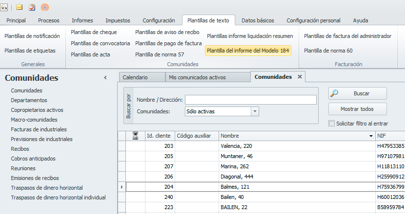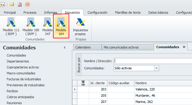 Marcar las comunidades que requieran la presentación del Modelo 184, se debe realizar desde la opción "Impuestos" de la ficha de la comunidad.