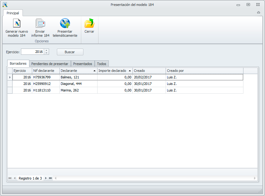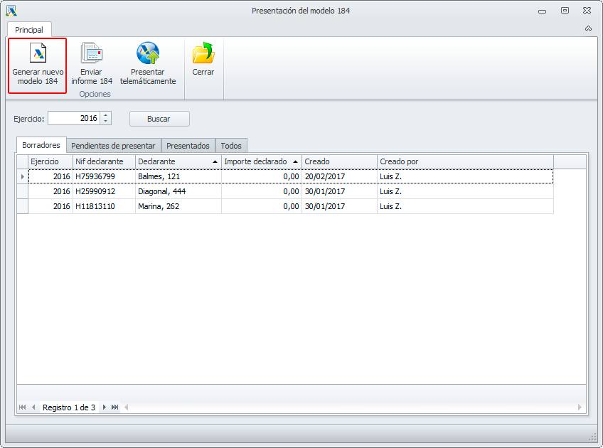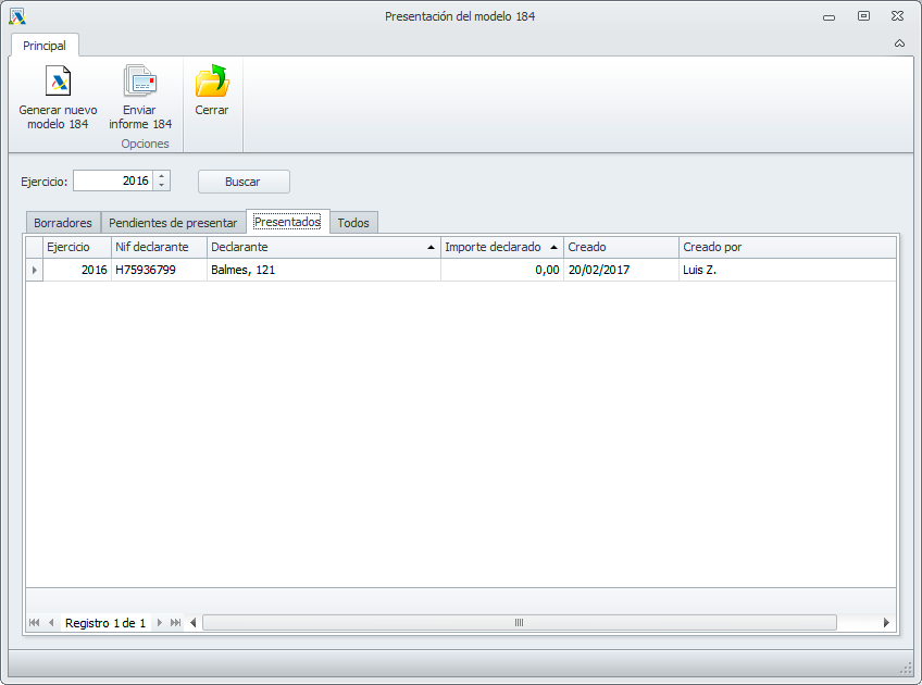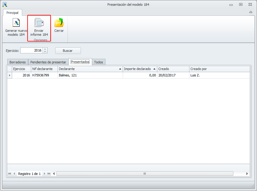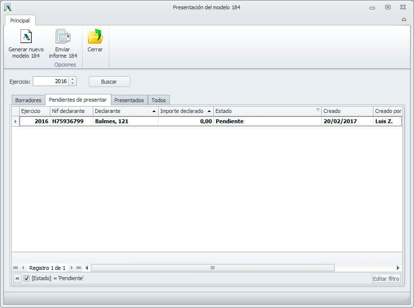 Los modelos generados aparecen automáticamente en el formulario de presentación de modelo 184, que contiene cuatro pestañas. Borrador, Pendientes de presentar, Presentados y Todos.