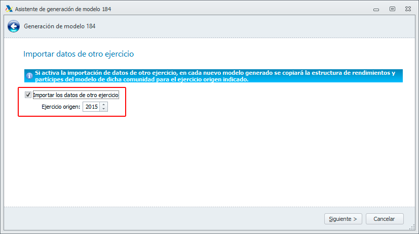A partir del segundo ejercicio en que se genera el modelo 184 con adminet, se podrán importar los datos declarados el ejercicio anterior. Si es la primera vez que realiza la presentación del impuesto con adminet, no debe marcar esta casilla.