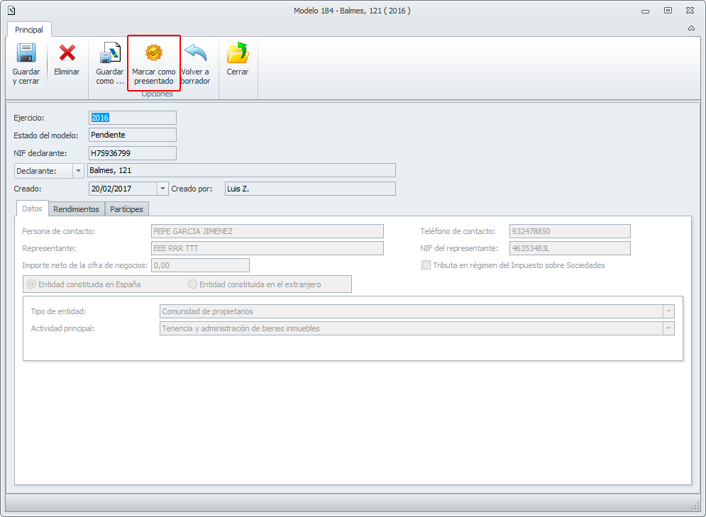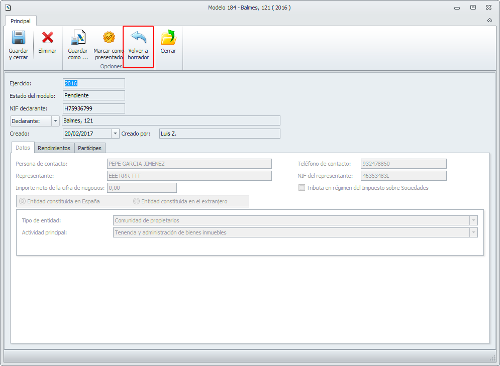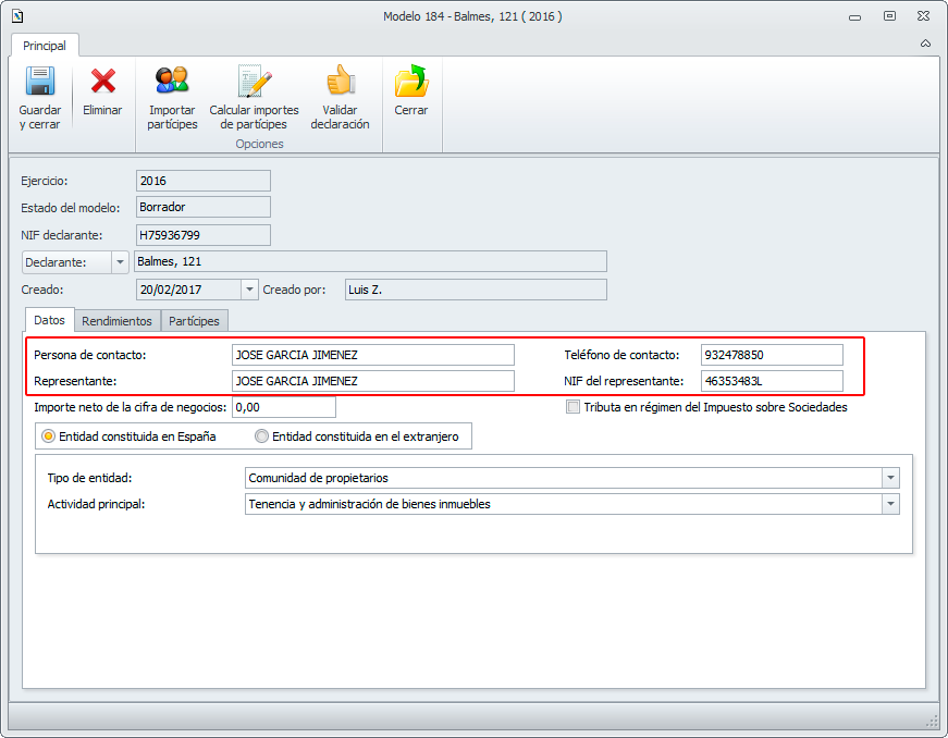 Le recordamos que la información referente a la 'Persona de contacto' y 'Representante' se copian desde la ficha de 'Datos empresa' apartado 'Datos para impuestos' de la pestaña 'Datos administrador'. Usted puede cambiarlo manualmente si lo desea. Vea el apartado 'Pasos previos para la presentación del modelo 184' ubicado en la cabecera de este mismo documento.