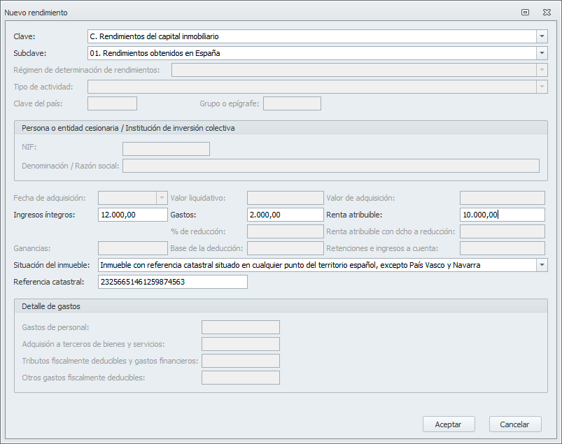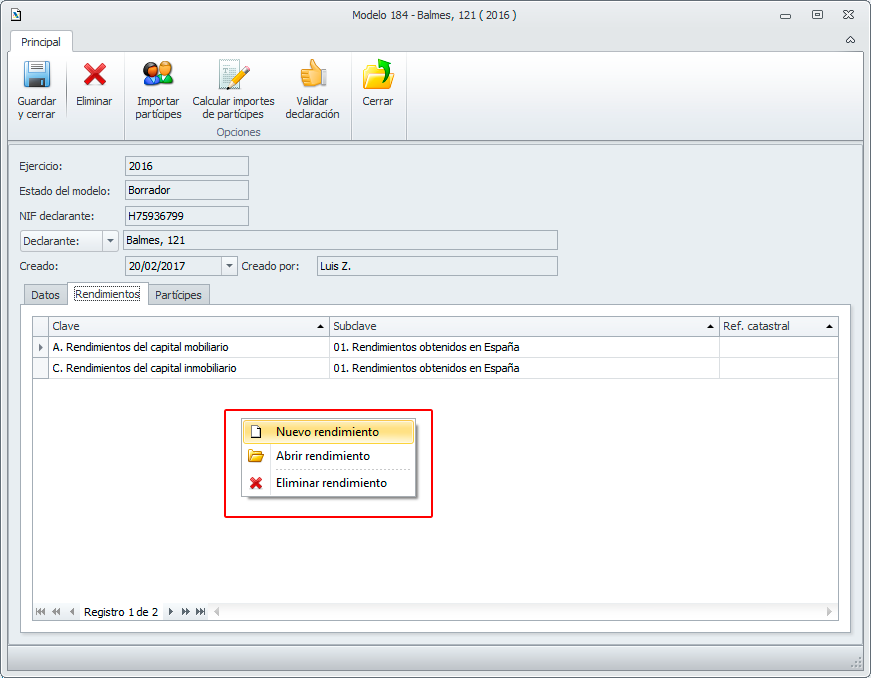 En la pestaña rendimientos, debe introducir la información de los diferentes rendimientos que se deban declarar. Haciendo clic con el botón derecho y seleccionando la opción 'Nuevo rendimiento'.