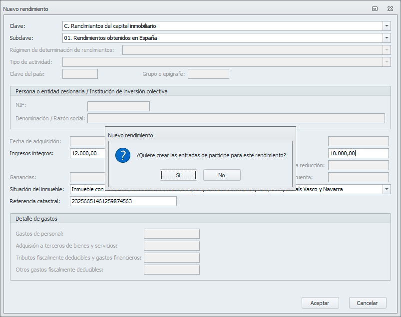 Al aceptar los datos de este formulario, el sistema pregunta si queremos que el mismo cree los registros de partícipe para este rendimiento. Hacemos clic en 'Sí'.