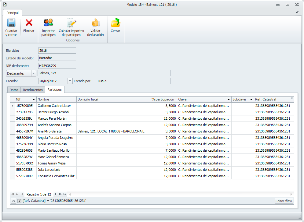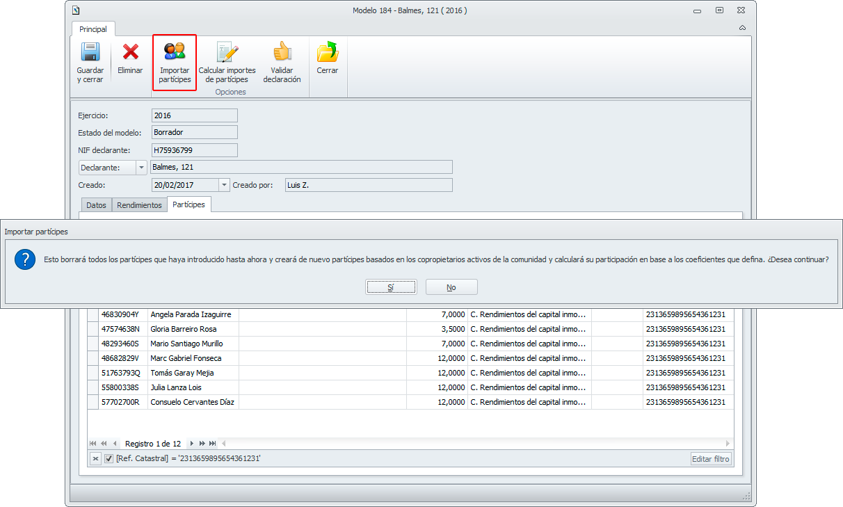 Si al introducir los datos del rendimiento seleccionó la opción de no generar los registros para los partícipes, puede crearlos a partir del botón 'Importar partícipes'. Tenga en cuenta que esta opción elimina los partícipes creados hasta el momento y los vuelve a generar a partir de los copropietarios activos de la comunidad calculando su participación a partir del coeficiente que seleccione.