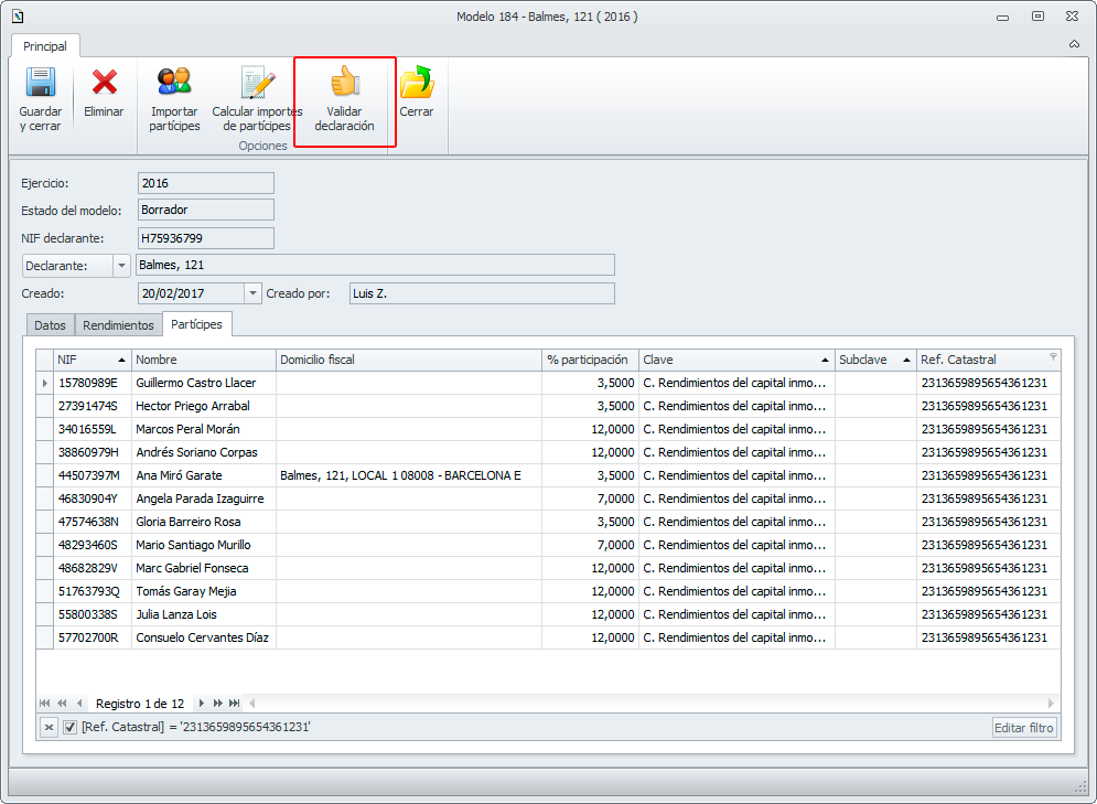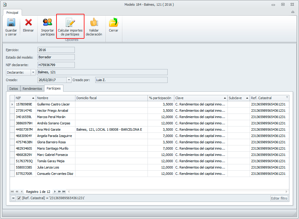 El botón de 'Calcular importes de partícipes' recalcula los importes a declarar para cada partícipe en función de su porcentaje de participación y los importes declarados en los rendimientos. Sólo es necesario usar esta opción si: