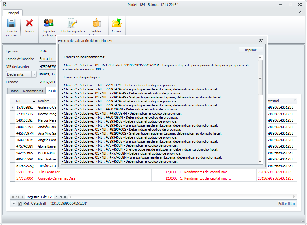 Si al validar la declaración se detectan errores, se mostrará una ventana con los errores y se marcaran en rojo aquellos registros que contengan errores.