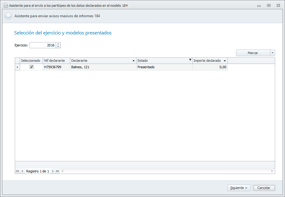 En el primer paso del asistente, debemos seleccionar el ejercicio y los declarantes a notificar.