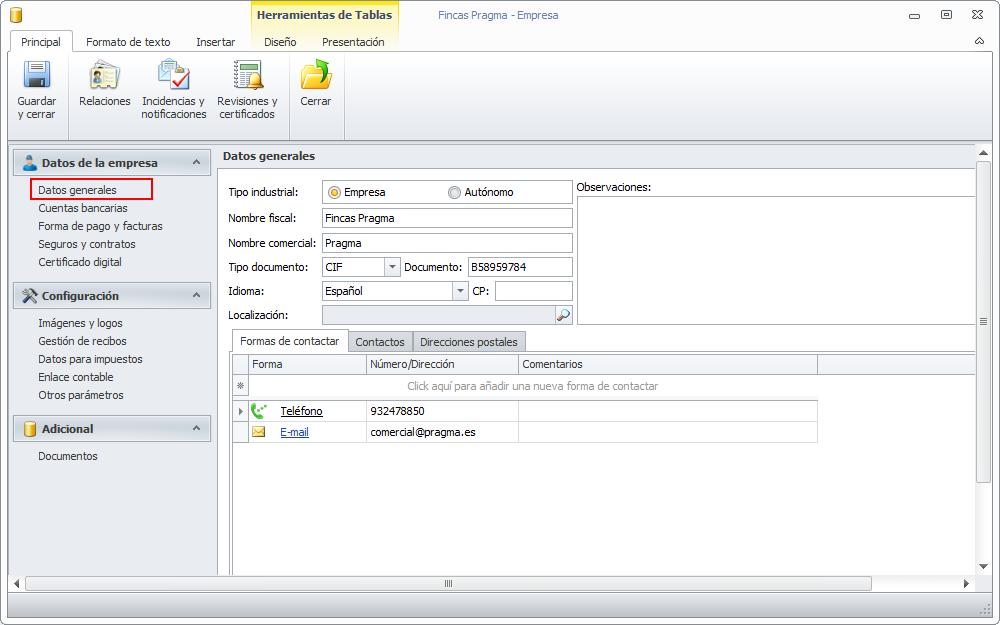 Se ha rediseñado la pantalla de datos empresa para redistribuir los datos y reagruparlos según su temática. La nueva ventana pasa a dividirse en secciones (parte izquierda). Al hacer clic en cada sección se muestran sus datos en la parte derecha de la ventana.