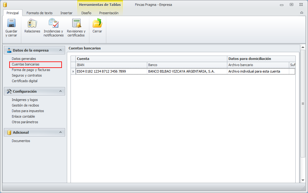 La sección Cuentas bancarias muestra los datos y características de trabajo de las cuentas bancarias de la empresa.