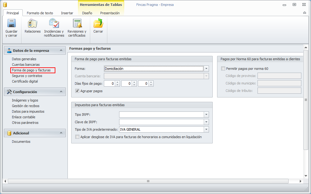 La sección Forma de pago y facturas contiene la configuración por defecto que se aplicará en las facturas que emita la empresa.