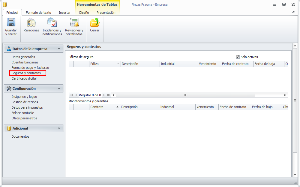 La sección Seguros y contratos muestra los seguros y contratos de mantenimiento que se han vinculado a la empresa.
