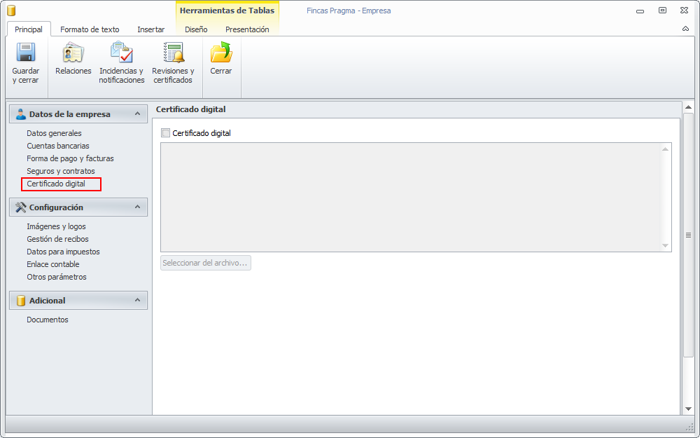 La sección Certificado digital permite guardar el certificado digital que usa la empresa para la presentación de impuestos a la AEAT, tanto propios como por cuenta de terceros.