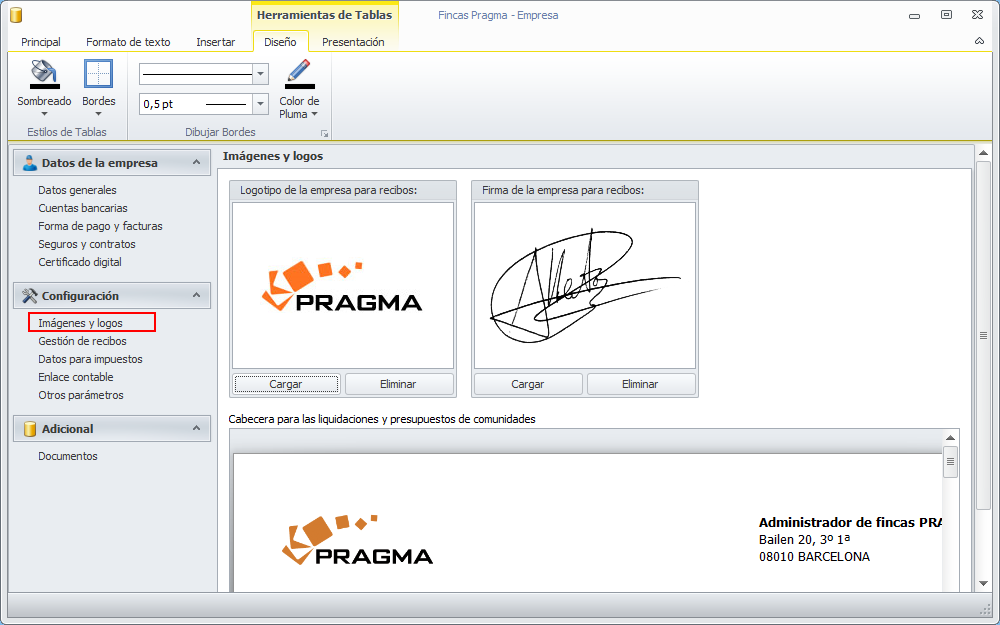 La sección Imágenes y logos permite guardar los logos y firas que se imprimirán en los recibos y en las liquidaciones.