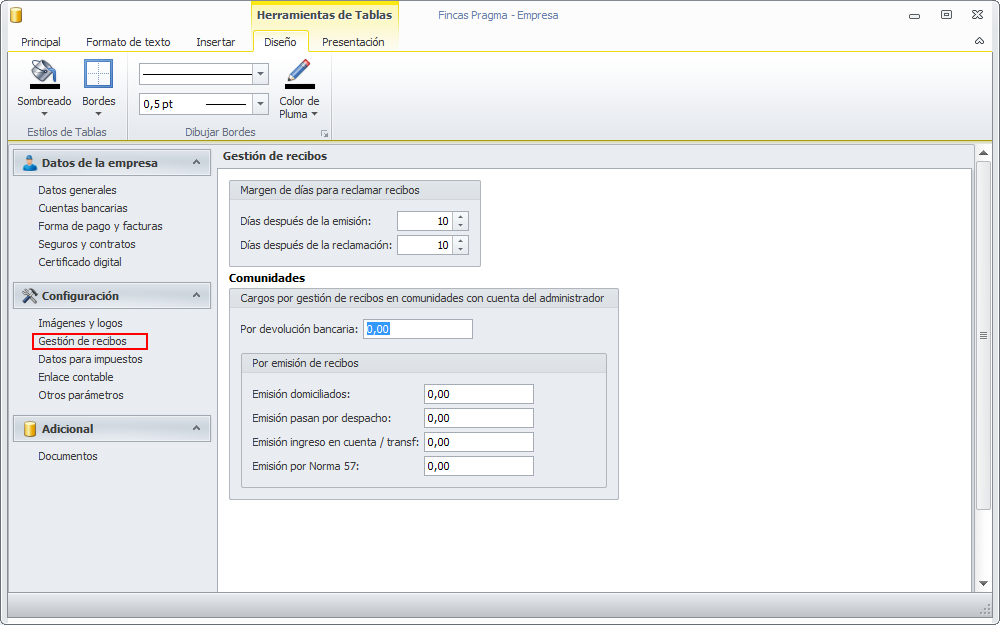 La sección Gestión de recibos muestra la configuración que se aplicará en la gestión de recibos por cuenta de terceros.