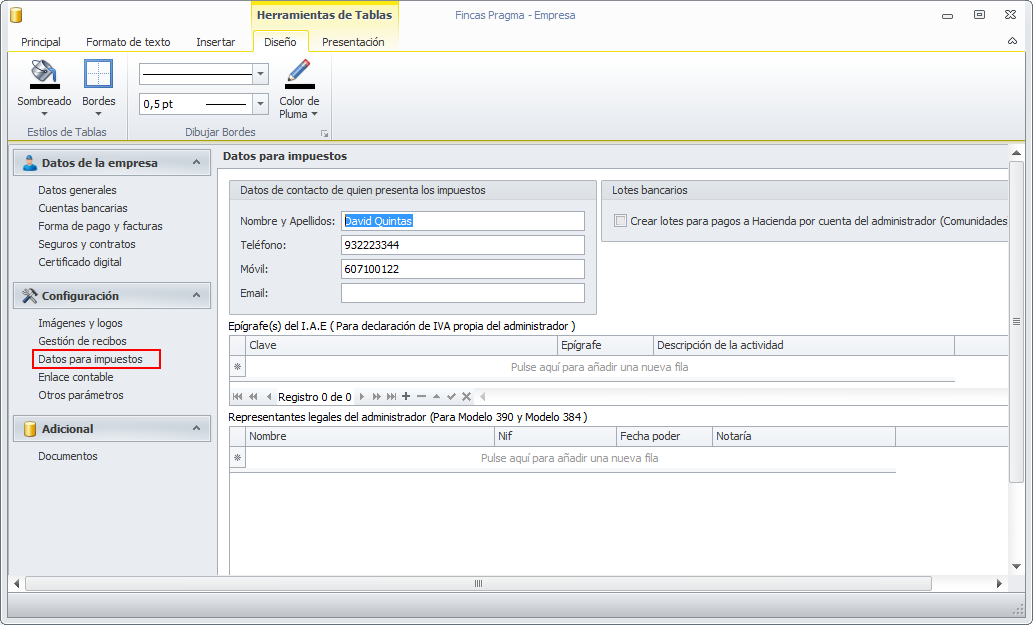La sección Datos para impuestos permite parametrizar los datos que se aplicarán por defecto en la confección de los impuestos, tanto propios como por cuenta de terceros.