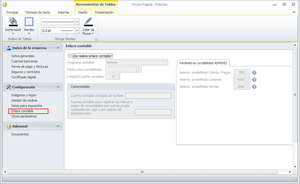 La sección Enlace contable permite activar y configurar la opción de enlazar los movimientos económicos de adminet hacia la contabilidad de adminis.