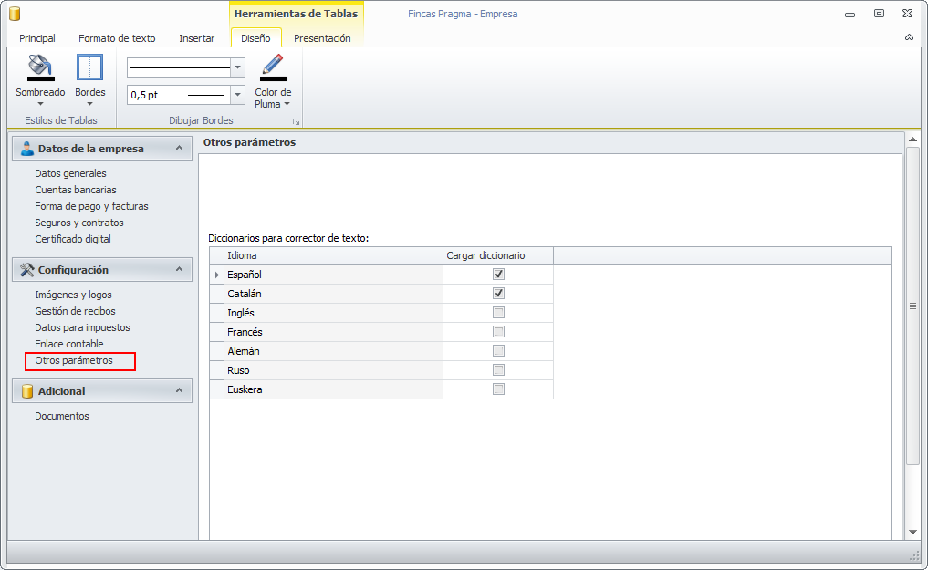 La sección Otros parámetros muestra una serie de parametrizaciones que no se puede clasificar en los apartados anteriores. Actualmente se pueden ver los diccionarios activos para la corrección de textos.