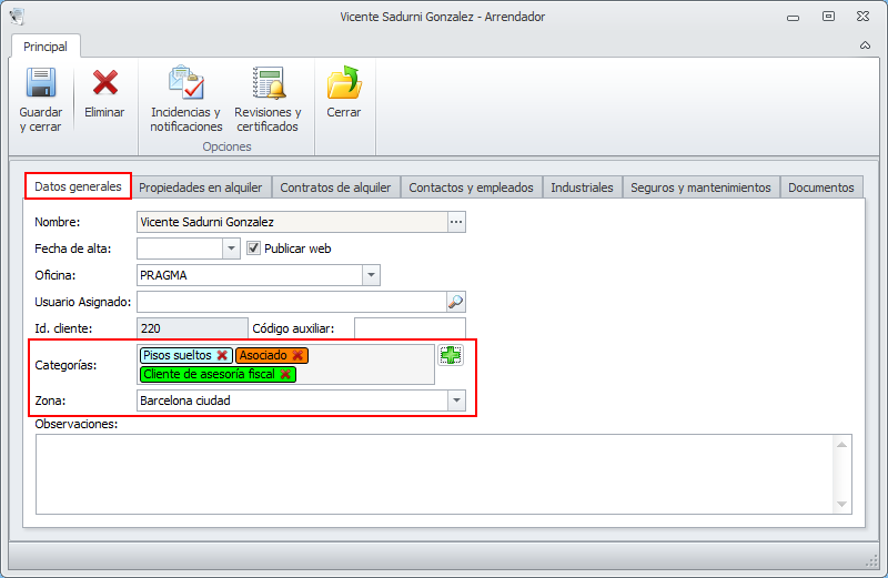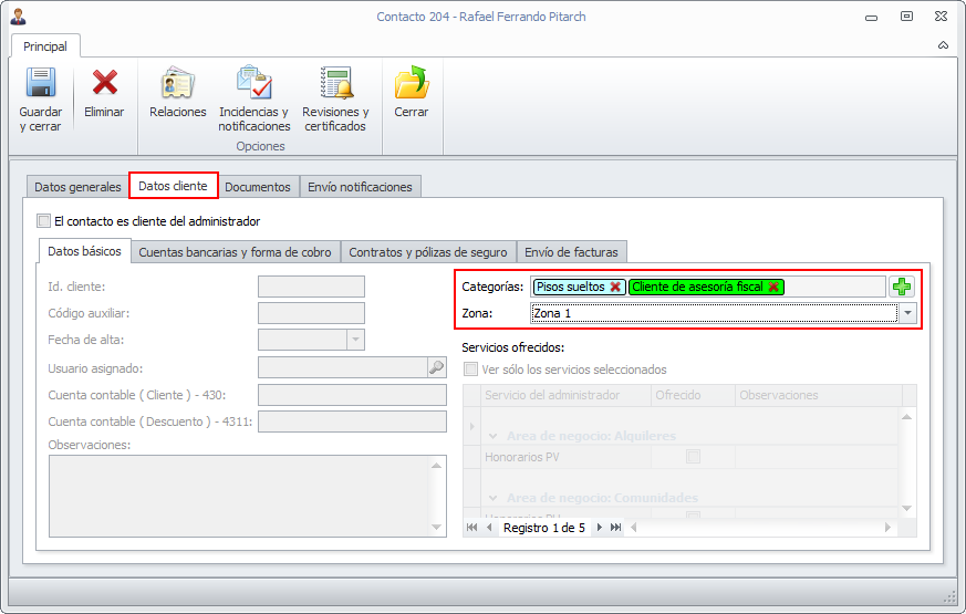 En las fichas de clientes se han añadido nuevas casillas para indicar la zona del cliente y las categorías con que se le desee identificar. En la casilla Zona sólo se puede indicar una zona. En cambio se le puede asignar tantas categorías como se desee.