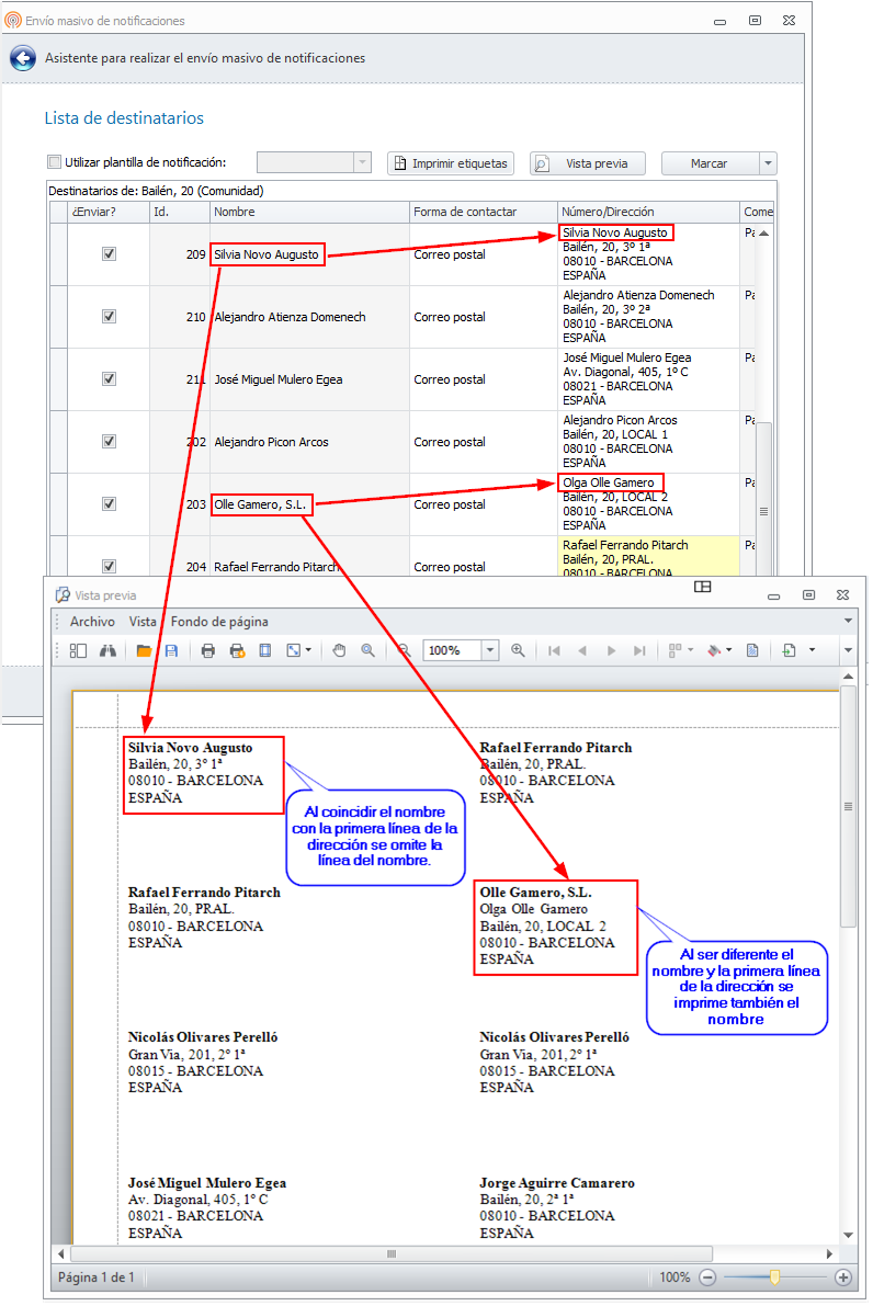 Al confeccionar las etiquetas para envíos masivos, se imprime una línea con el nombre del destinatario y en las líneas inferiores su dirección. Si en los datos correspondientes a la dirección se detecta que se repite el nombre del destinatario, sólo se imprimirá una de las dos líneas, evitando así la duplicidad.