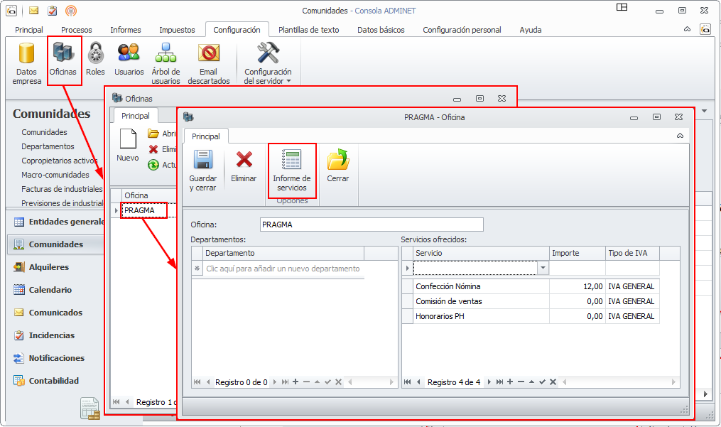 En la ficha de la oficina, que se encuentra en el apartado Configuración, se ha incorporado un botón Informe de servicios.