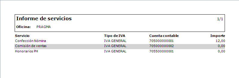 El informe tiene el aspecto que puede ver en la siguiente imagen. Los datos correspondientes a las cuentas contables sólo se verán si se tiene activada la casilla Enlace contable en la ficha de Datos empresa.