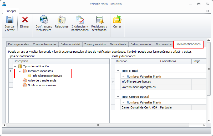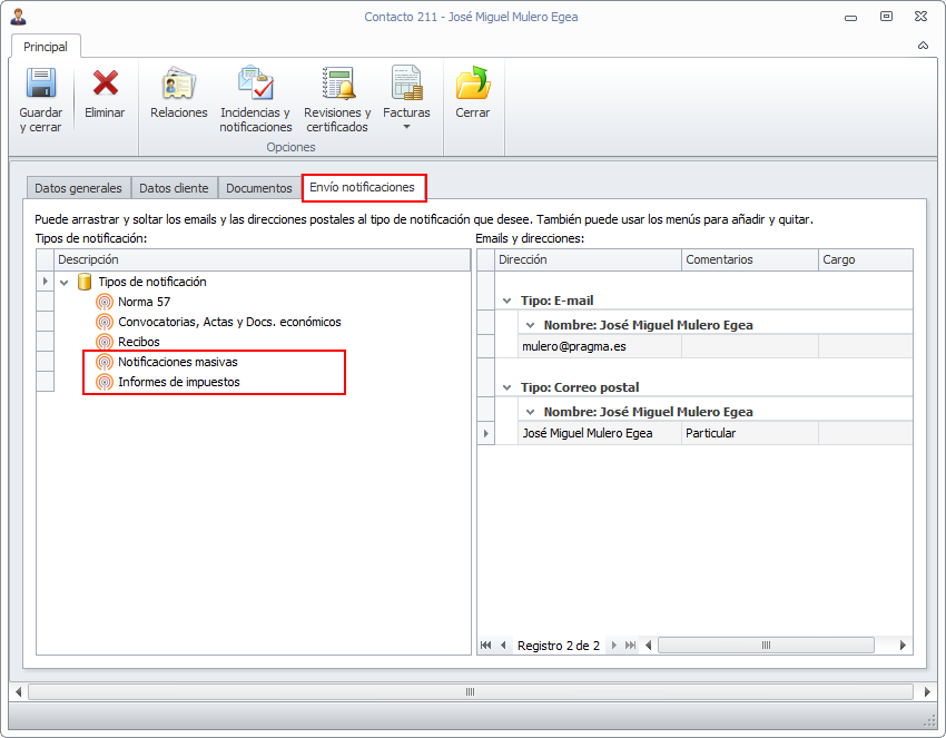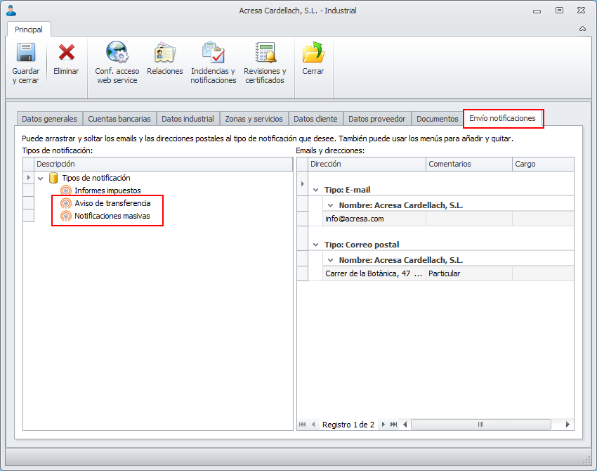 Se han añadido nuevos tipos de notificación en las fichas de contacto e industrial. Son los siguientes: