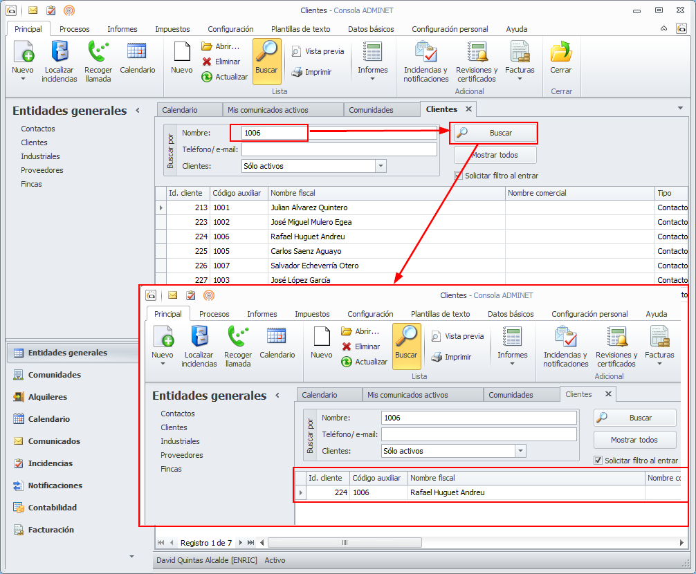 En la lista de clientes , se permite realizar la búsqueda también en la columna Código auxiliar. Para ello basta con indicar el código a buscar en la casilla Nombre y hacer clic en el botón Buscar.
