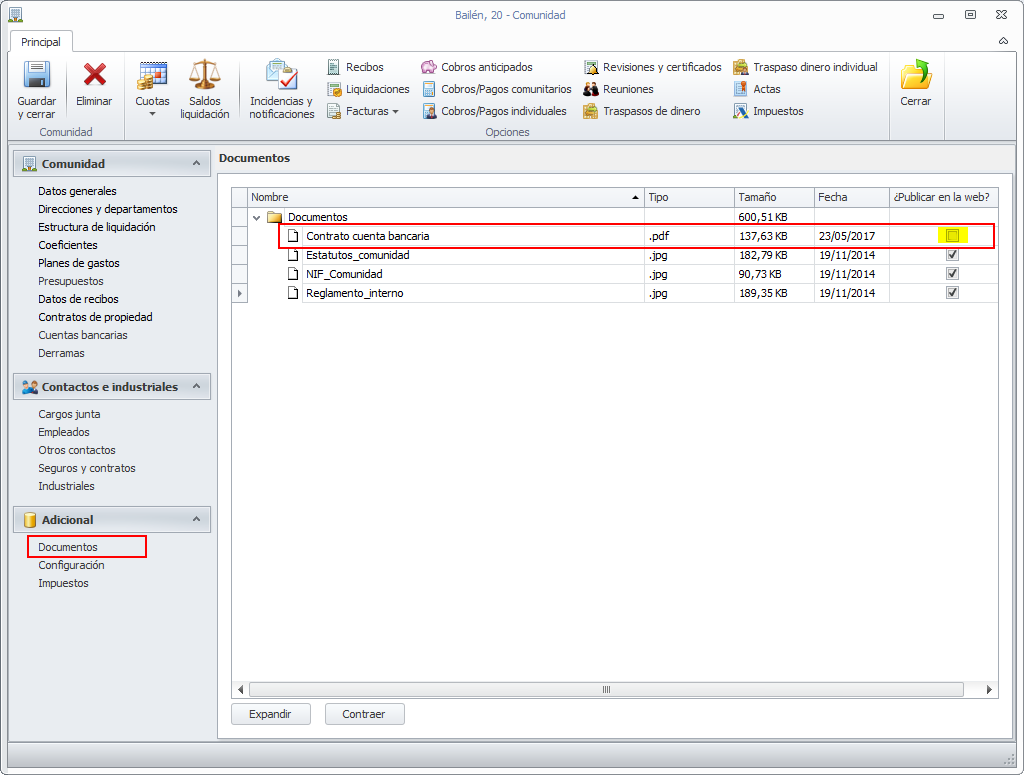 Aquellos archivos que se añadan al apartado Documentos de la ficha de la comunidad , por defecto tendrán desactivada la casilla publicar en la web. Deberán ser marcados de forma expresa para que puedan ser publicados.