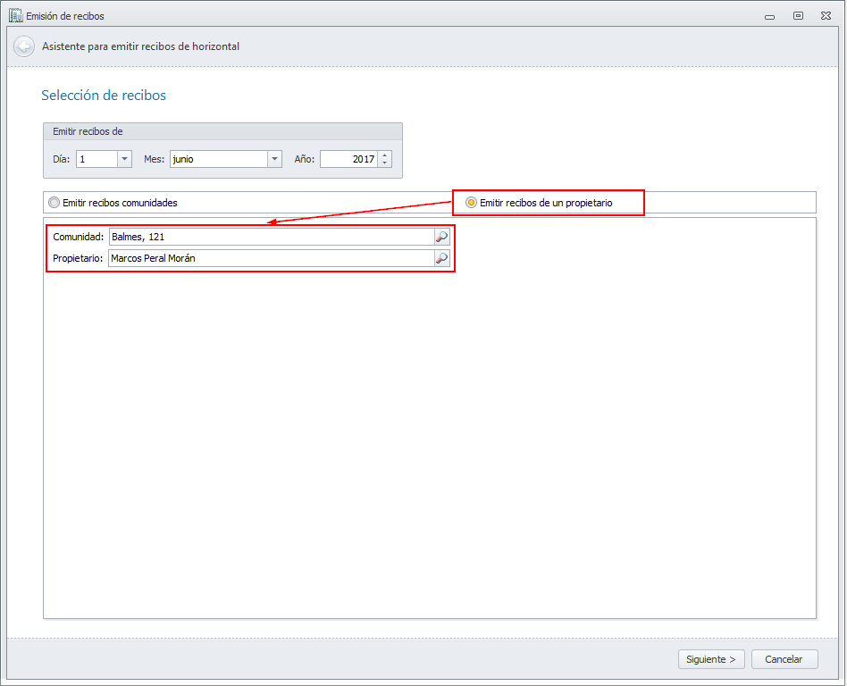 En la emisión de recibos se contempla la posibilidad de emitir un recibo para un único copropietario. Se ha modificado el asistente para que pueda escoger....