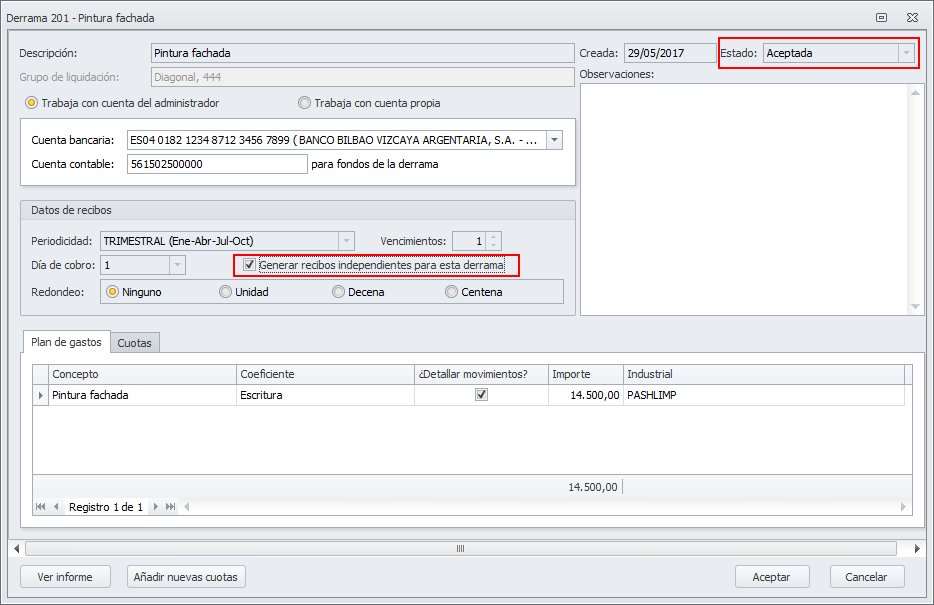 Permitir modificar la casilla “Generar recibos independientes para esta derrama” en derramas aceptadas