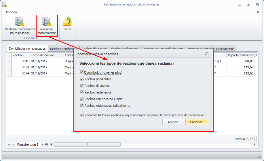 En reclamación de recibos añadir una opción para "reclamar todos" incluyendo pendientes, devueltos, reclamados...
