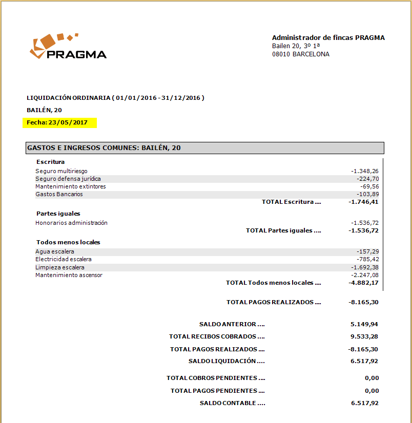 Se añade la fecha de emisión en todos los informes que se obtienen en la liquidación. Vea unos ejemplos a continuación.