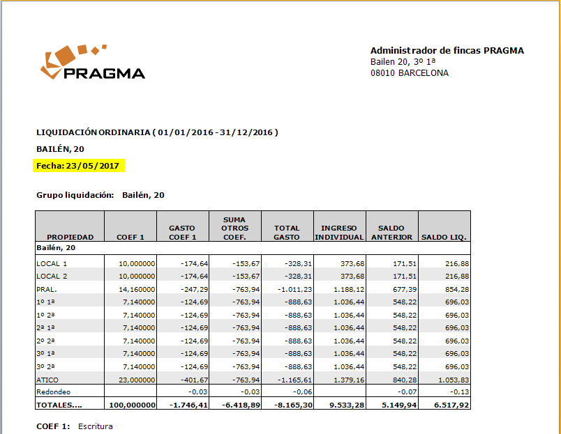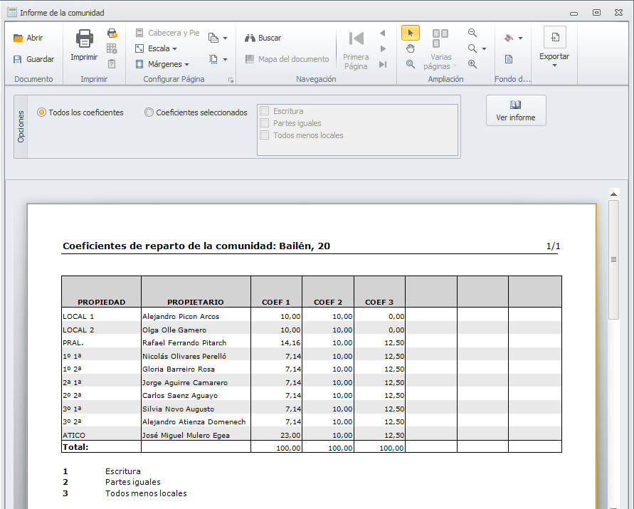 A este informe se accede haciendo clic con el botón derecho sobre la comunidad en el selector de comunidades y escogiendo la opción de menú Informes / Coeficientes de reparto. Vea, a continuación cómo queda el nuevo diseño.