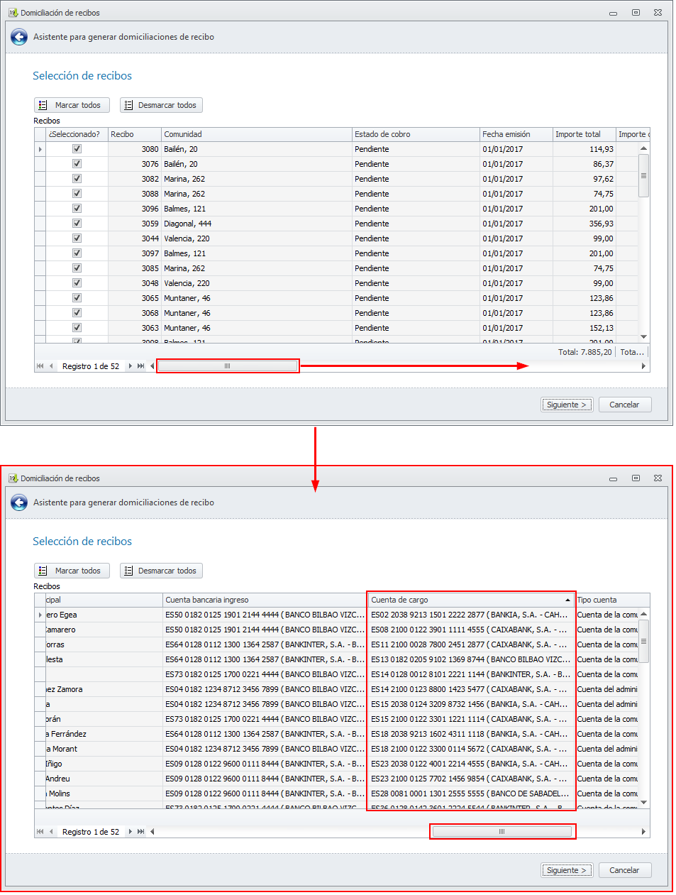 Se añade la cuenta de domiciliación bancaria del pagador, tanto en el asistente de la domiciliación como en el informe de la misma. En el asistente, esta columna tiene el título Cuenta de cargo y se encuentra en la parte derecha de la ventana.